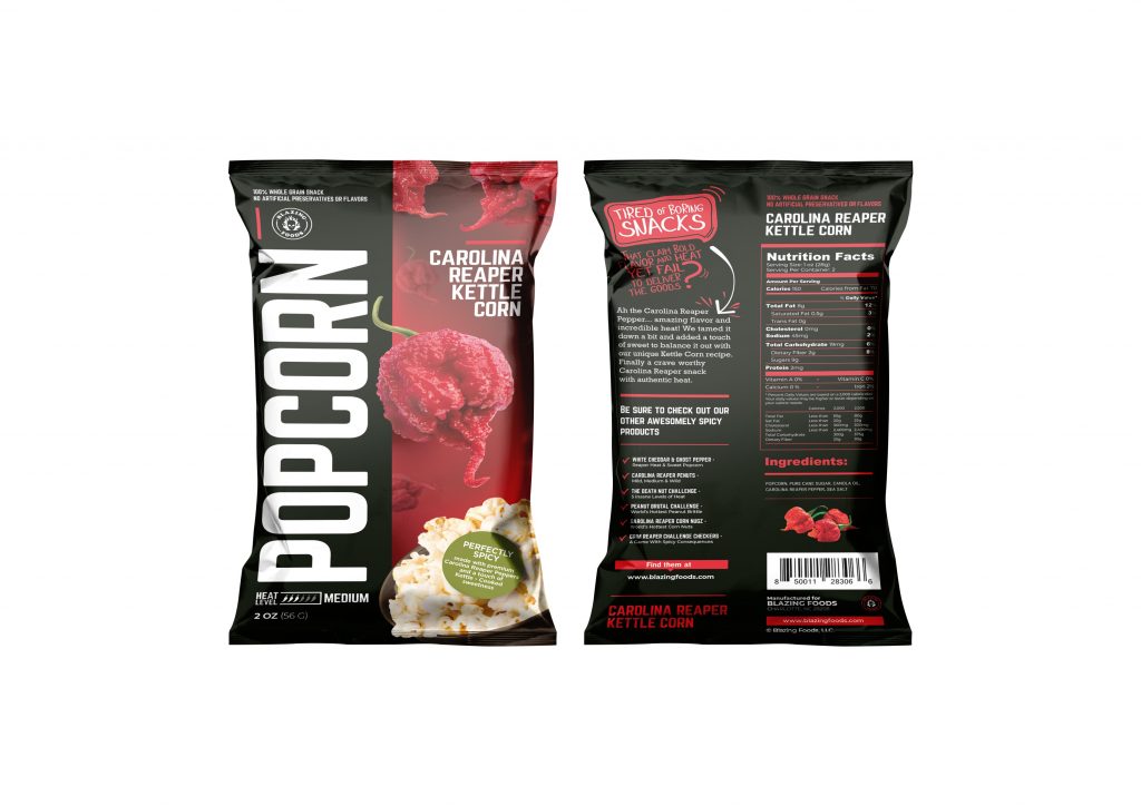 - Spicy Popcorn: Carolina Reaper Kettle Corn – for those that prefer a perfectly balanced bold flavor blending a touch of sweetness with Carolina Reaper Pepper heat this is for you! We use an old-fashioned Kettle Corn recipe combined with 100% real ingredients and premium Carolina Reaper Peppers to create a truly addictive snack with attitude! We rate this one medium for non-chile-heads and mild for the hardcore pepper fanatics.